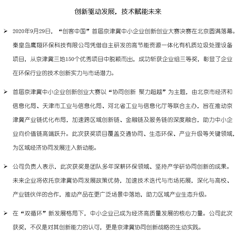 喜報!秦皇島鷹翔環保科技有限公司榮獲“創客中國”首屆京津冀中小企業創新創業大賽企業組三等獎